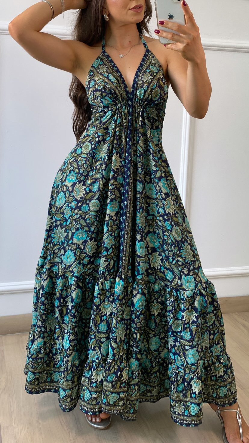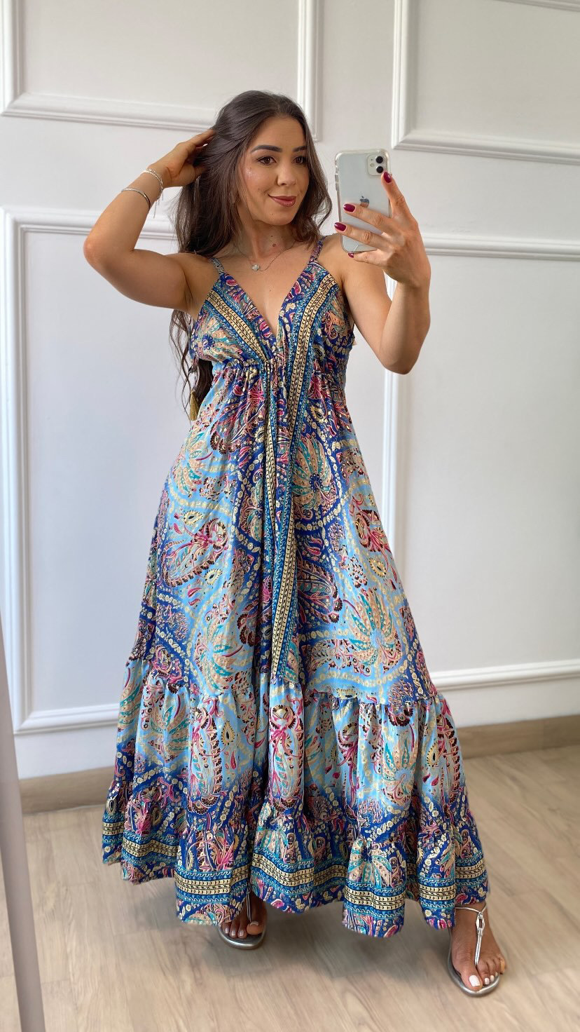 VESTIDO INDIANO OASIS é a escolha perfeita para quem busca um look fluido e cheio de vida neste verão. Confeccionado em seda indiana de alta qualidade, veste do 36 ao 44, garantindo conforto e elegância. As estampas são simplesmente maravilhosas, refletindo a autenticidade e o charme da cultura indiana. Ideal para dias quentes, é a peça que faltava para seu guarda-roupa brilhar com estilo e frescor!